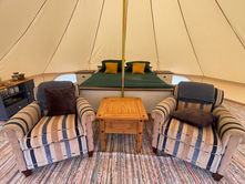 Inside you’ll find a proper superking-size bed (no airbeds here!), snuggly armchairs, soft rugs, and twinkly fairy lights that make evenings cosy and inviting. With bedside lamps, extra blankets, and thoughtful touches, it’s all about comfort without losing the charm of a true camping experience. Tea and coffee making facilities and a few other touches can be found to make your stay that little bit more special! (Check out the video below!)